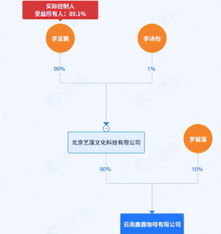 工商信息显示,今年3月底,他在云南昆明注册了云南麋鹿咖啡有限公司,自己持股 89.1%,拥有绝对控制权。